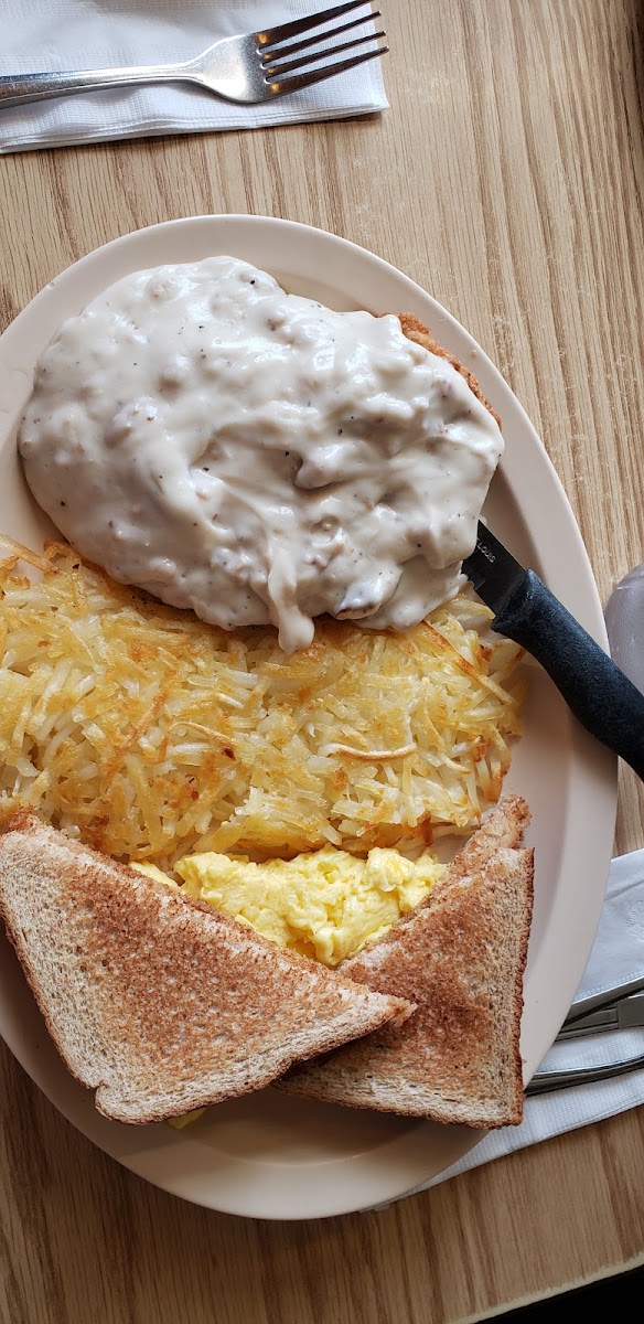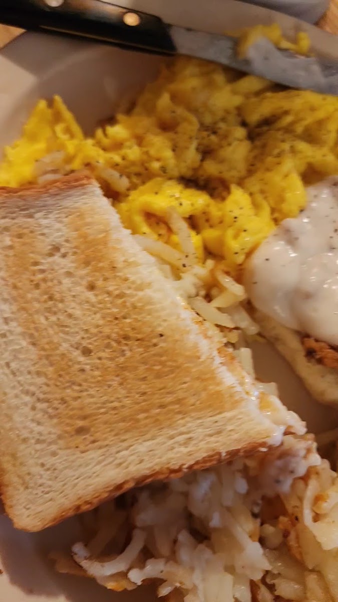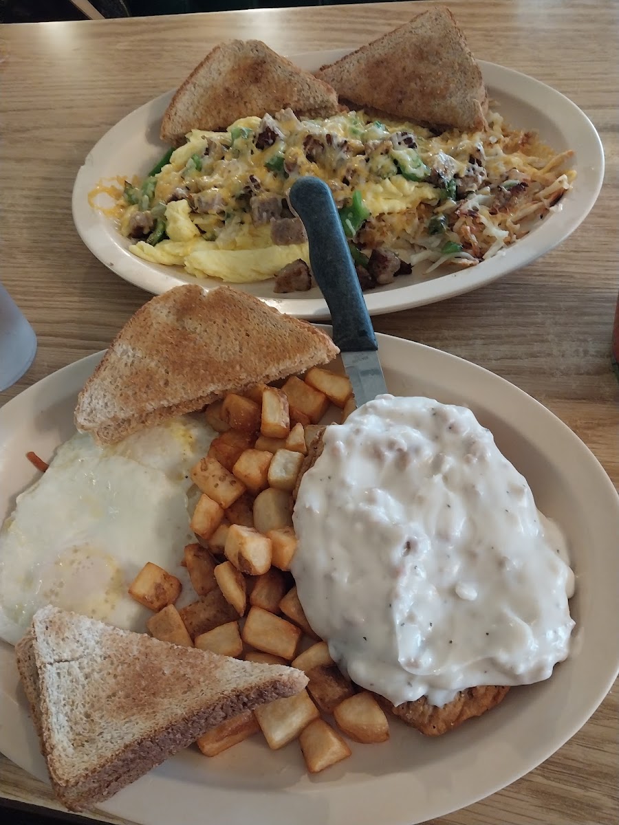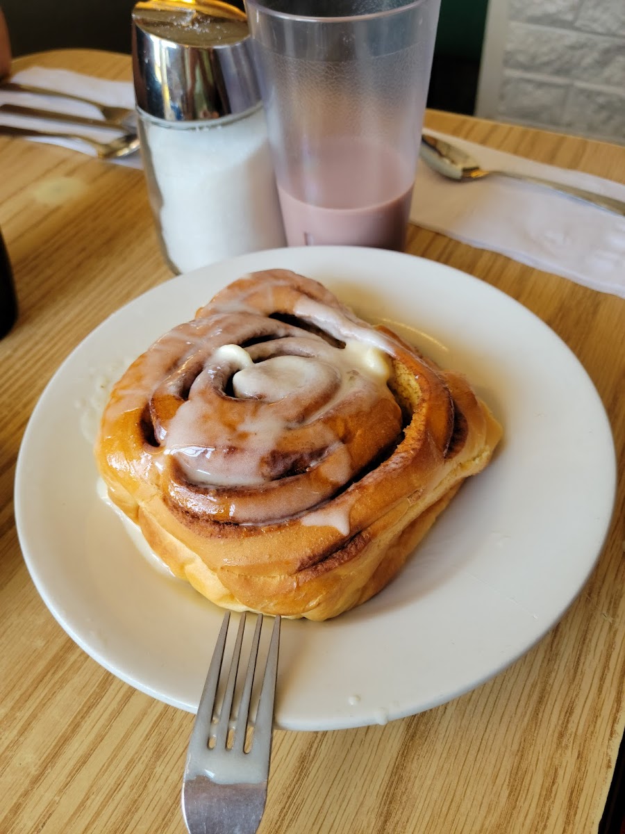 1st timers. We recommended to try the cinnamon roll. Menu is deceiving, because it says rolls. I ordered one, my son ordered two! The were HUGE. Very delicious, my only complaint is they were not served warm. Coffee cup was always full. The chicken fried steak and eggs showed up about 15 minutes later. Would have been nice to all eat together, but everything was amazing. Great staff. Definetly plan to be back, there were A LOT of great menu items, not to mention I didn't notice the specials until after I placed my order. Great place to grab a bit to eat! Highly recommend!