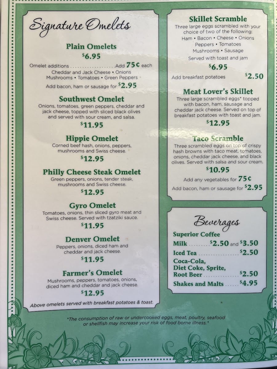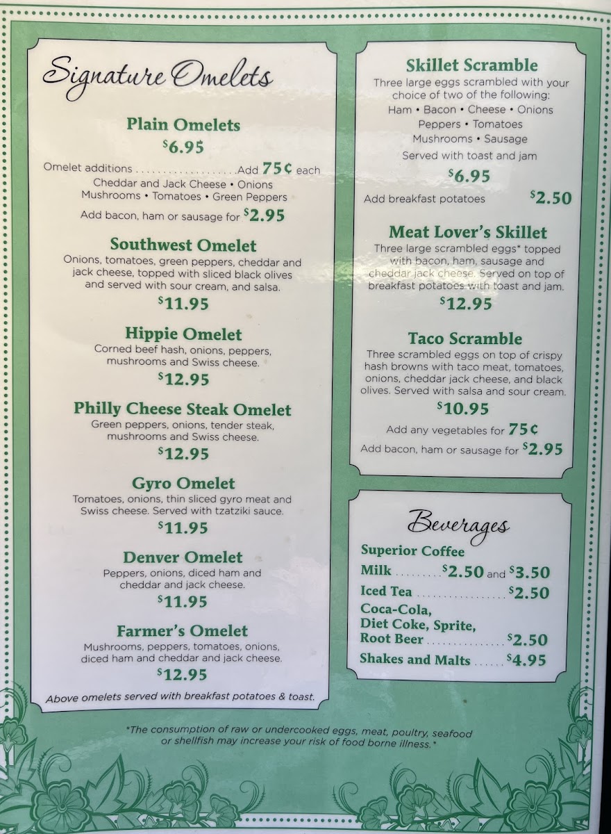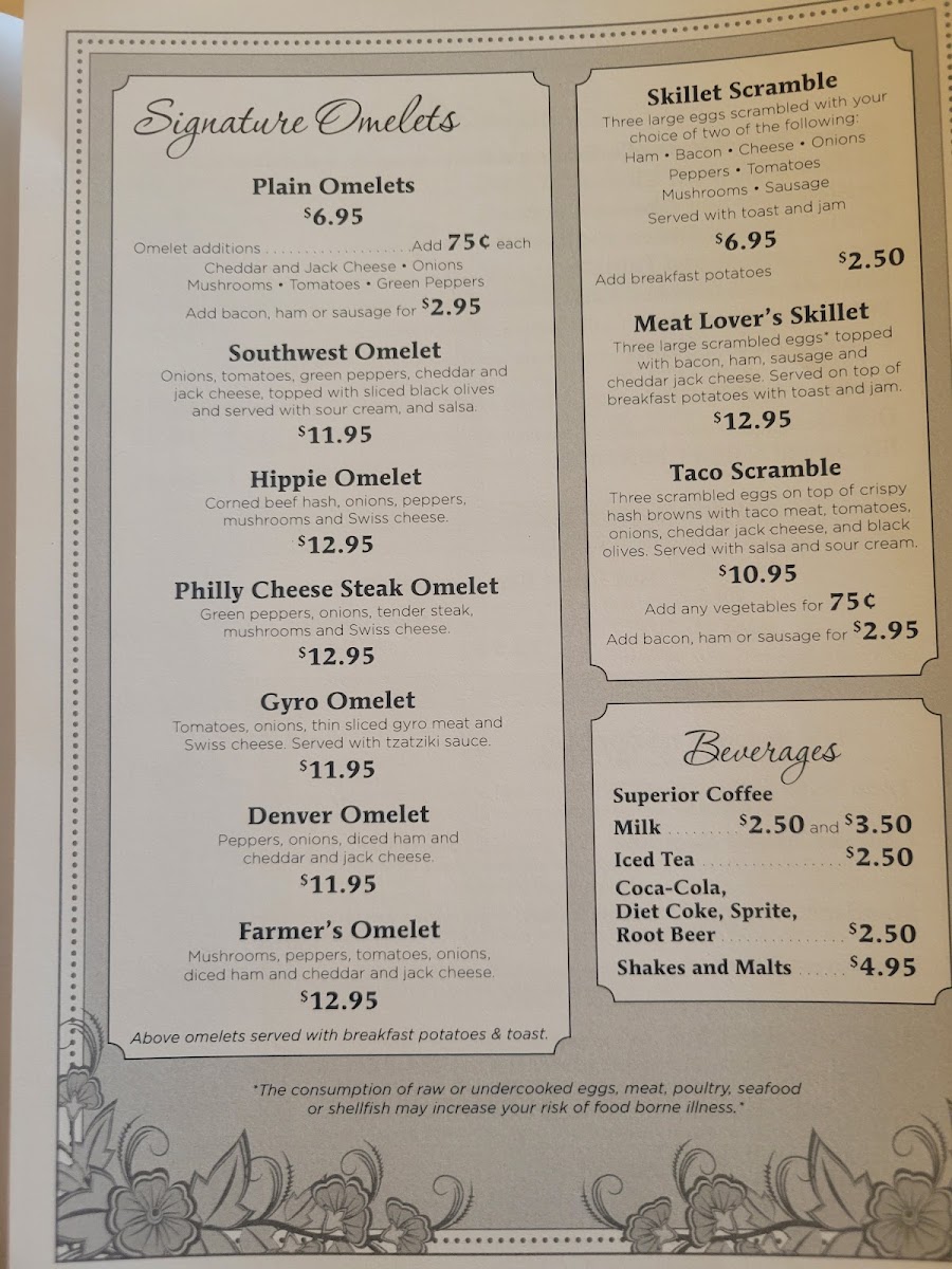 The menu features hearty options such as country fried steak and eggs, flavorful omelets like the Hippie Omelette or Ultimate Steak Scramble, and sweet griddle treats including cinnamon rolls and French toast. Alongside these, you'll find freshly brewed coffee and rich hot chocolate, complementing the inviting atmosphere where locals gather to enjoy casual conversations and a relaxed pace.
