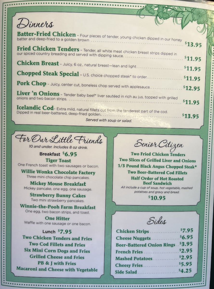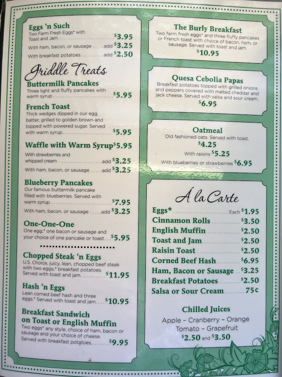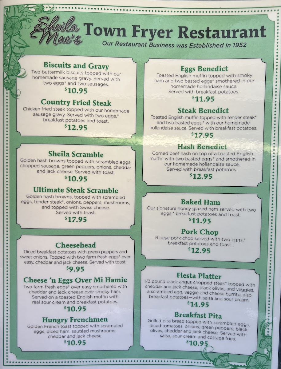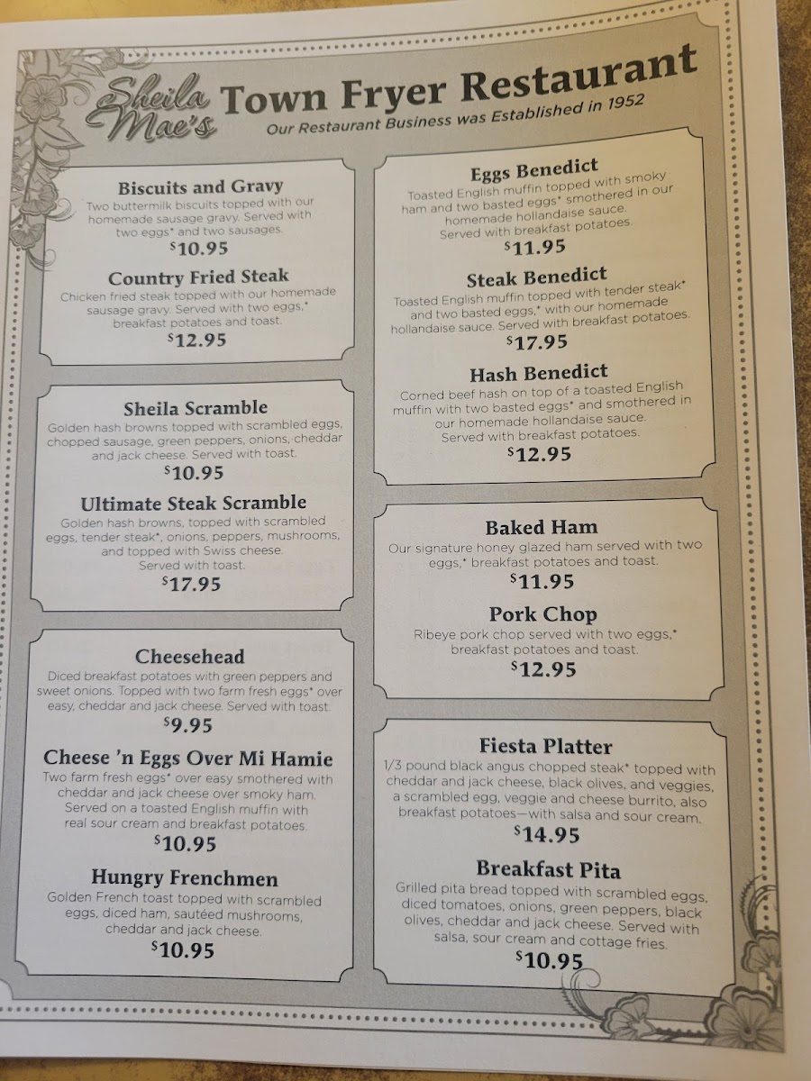 Sheila Mae's Town Fryer offers a straightforward and comforting breakfast menu that feels like a welcoming morning ritual in a small-town café. The dishes are classic, familiar, and generously portioned, perfectly suited for starting the day with a warm, satisfying meal.